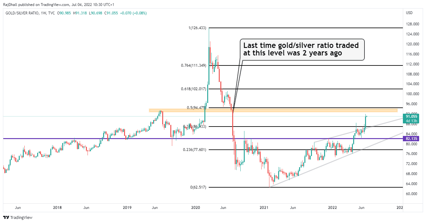 Sopra, c'è un po' di traffico in arrivo. Il prossimo è l'area arancione a 93,30. È anche la zona di ritracciamento di Fibonacci al 50% dallo swing alto allo swing basso. Per ora, il prezzo sta registrando massimi e minimi più elevati e l'oro sta resistendo meglio dell'argento. Ciò fa aumentare il rapporto oro/argento.