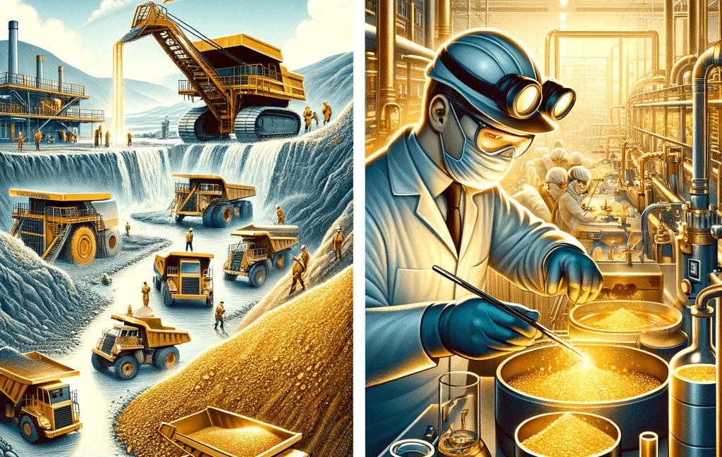 Oggi le grandi compagnie minerarie non utilizzano più picconi e altri attrezzi manuali per estrarre le pepite d'oro dal sottosuolo e rimuovere le particelle indesiderate. Si affidano invece a metodi più produttivi, che però richiedono un elevato consumo di acqua o l'uso di sostanze chimiche. Quando si acquista oro non riciclato, è quindi molto probabile che il metallo abbia subito uno dei tre trattamenti principalmente utilizzati nell'industria mineraria.