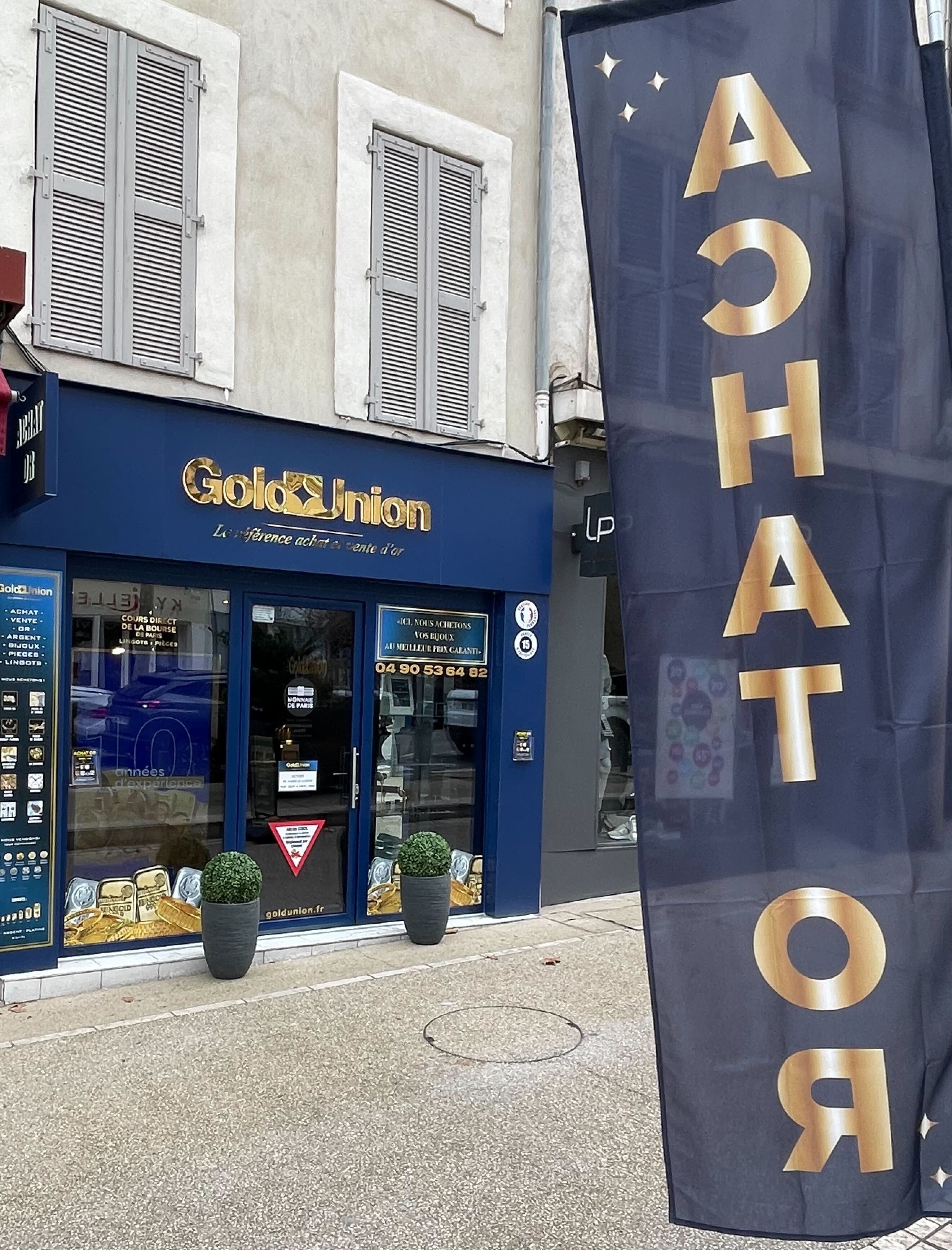 La devanture bleu GoldUnion est à côté du magasin Nicolas juste avant la mairie et en face du magasin Bouygues telecom.