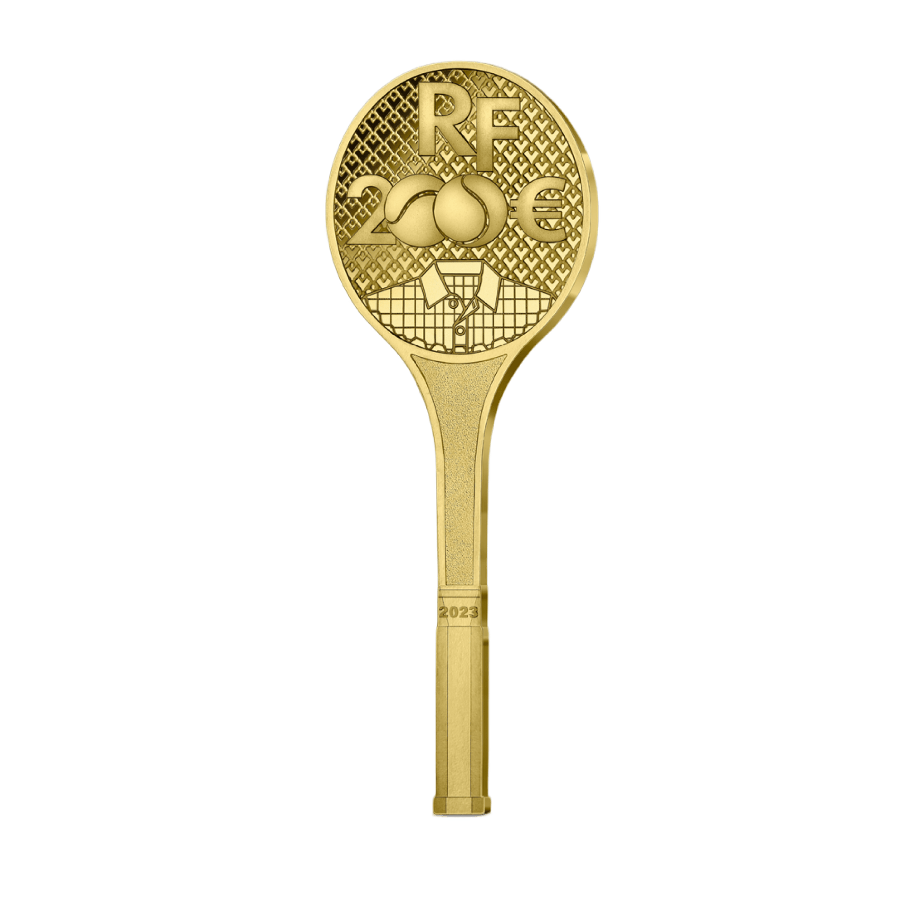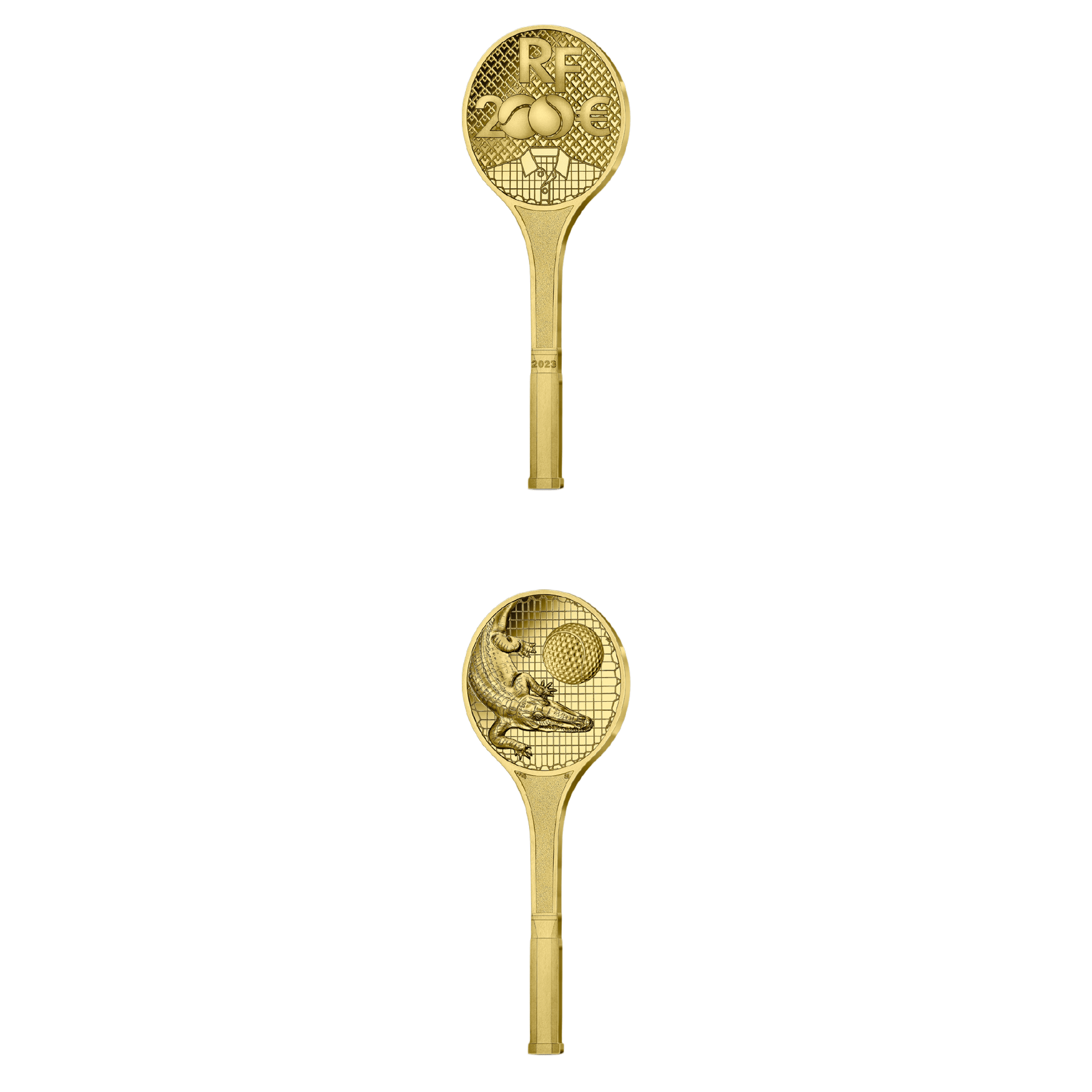 La forma della moneta è un doppio riferimento a René Lacoste, campione di tennis e creatore della prima racchetta in metallo.